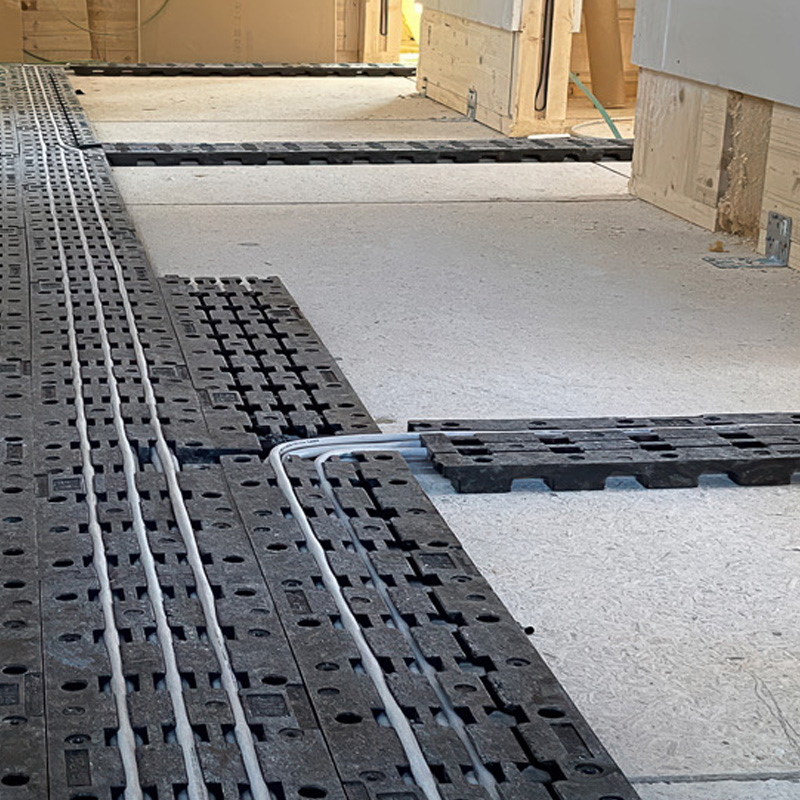Elektrische Leitungen werden häufig auf der Rohdecke verlegt und in den Fußbodenaufbau integriert. Dabei sind sie oft ungeschützt, und eine Trennung von Schwachstrom-, Daten- und Starkstromleitungen ist nur schwer möglich. Die Verlegung der Leitungen in Schutzrohren ist sehr aufwendig. Zusätzlich entstehen oft Kreuzungen, die aufgrund der geringen Aufbauhöhen nur schwer umsetzbar sind, insbesondere, wenn Heizungs- und Trinkwasserleitungen bereits auf dem Rohfußboden installiert sind.